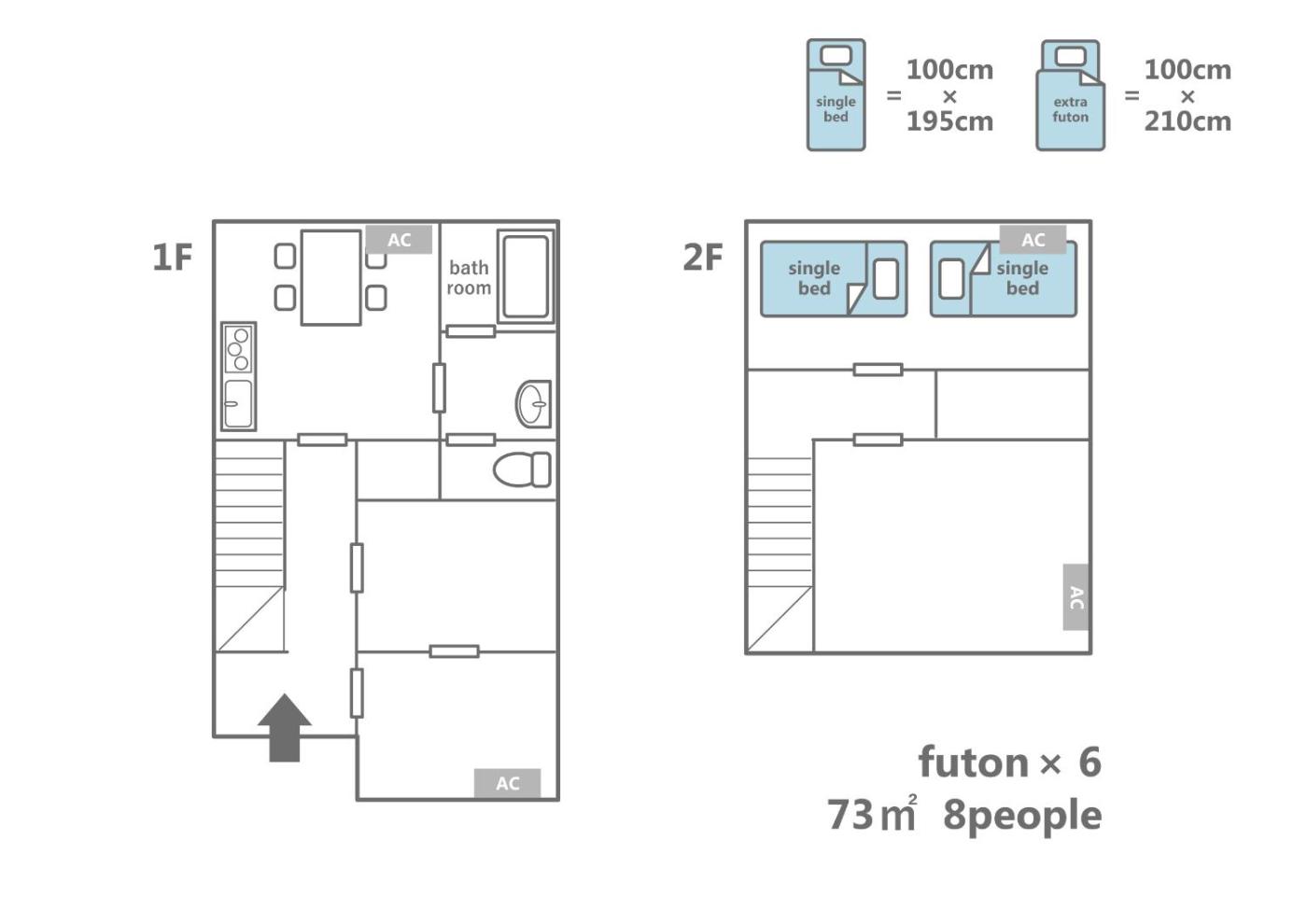 Three-Bedroom House. Featuring a private entrance, this air-conditioned holiday home comprises a kitchen, 3 bedrooms and 1 bathroom with a bath and a shower. The well-equipped kitchen features a stovetop, a refrigerator, kitchenware and a microwave. The holiday home has tatami floors and provides a washing machine, a dining area and an electric kettle. The unit offers 2 beds and 6 futons.