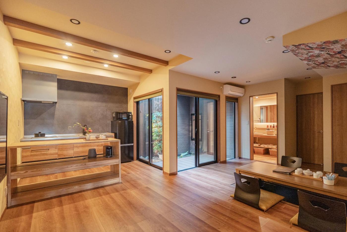 Two-Bedroom Villa. The hot tub is the standout feature of this villa. This villa includes 1 living room, 2 separate bedrooms and 1 bathroom with a bath and free toiletries. The kitchen is fitted with a refrigerator, kitchenware and a microwave. The air-conditioned villa offers a flat-screen TV, a washing machine, tatami, a tea and coffee maker as well as ancourtyard view. The unit has 3 beds and 4 futons. ;