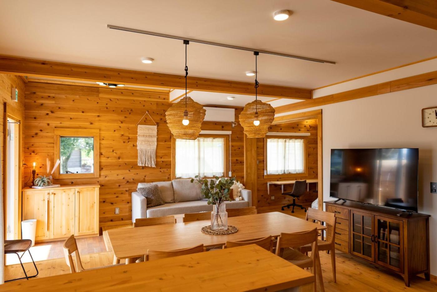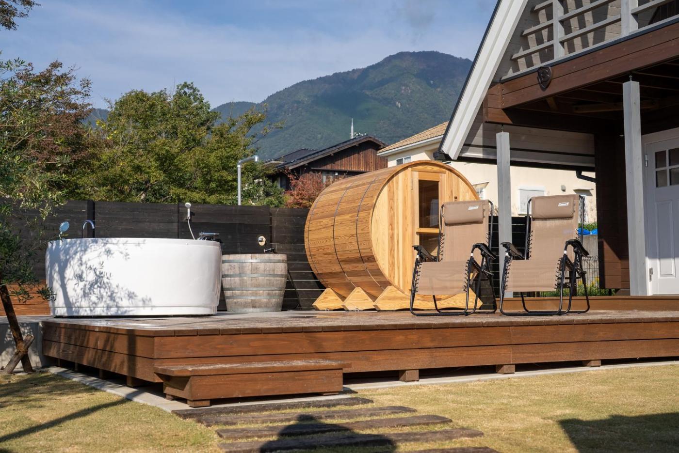 Three-Bedroom Villa. The hot tub and sauna are the standout features of this villa. Featuring a private entrance, this air-conditioned villa is comprised of 1 living room, 3 separate bedrooms and 2 bathrooms with a bath and a shower. Guests will find a stovetop, a refrigerator, kitchenware and a microwave in the well-fitted kitchen. The villa also has a barbecue. The villa offers a flat-screen TV with streaming services, a washing machine, tatami, a tea and coffee maker as well as garden views. The unit offers 4 beds and 2 futons.