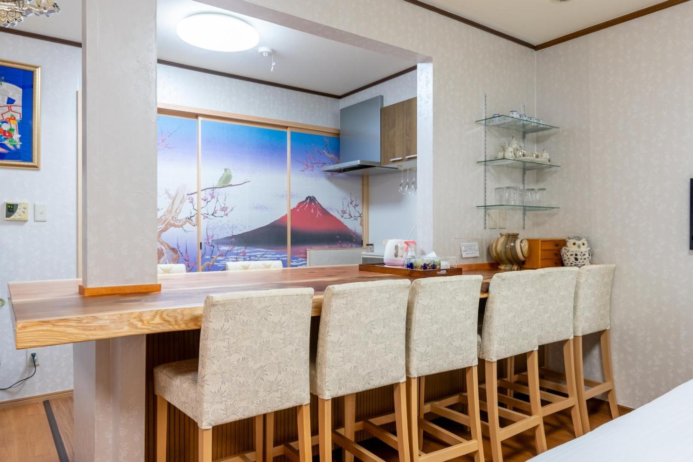 Villa. This villa consists of 1 living room, 3 separate bedrooms and 2 bathrooms with a shower and free toiletries. The villas kitchenette, which has a refrigerator and a microwave, is available for cooking and storing food. This villa is air-conditioned and features a flat-screen TV, tatami, a wardrobe and an electric kettle. The unit offers 13 beds and 3 futons.