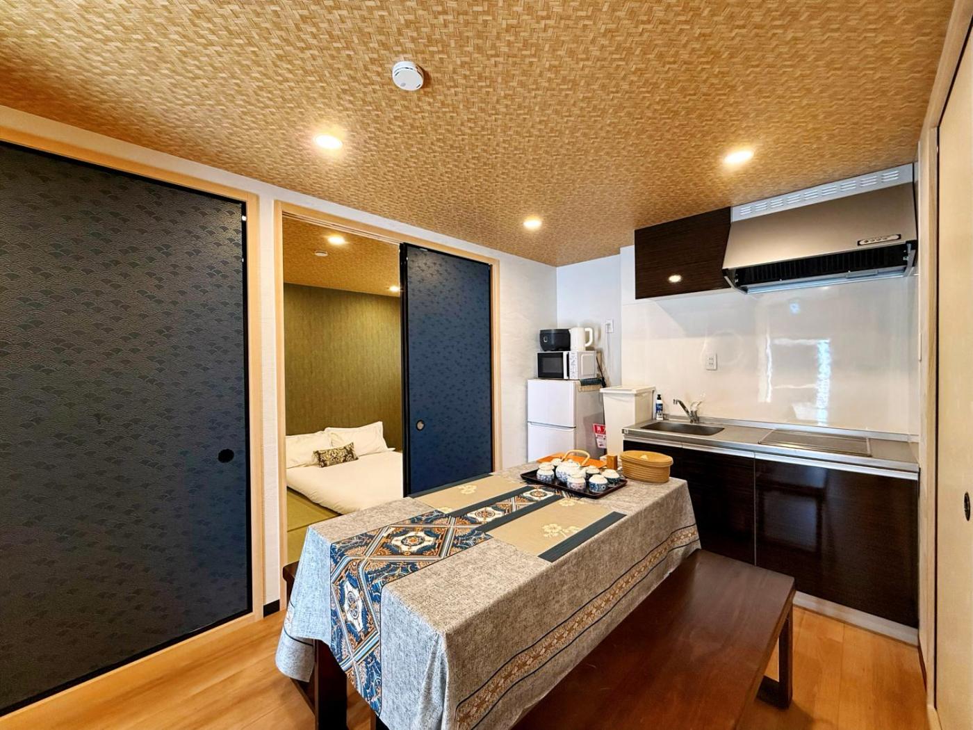 Three-Bedroom Apartment. Guests will have a special experience as this apartment features a hot tub. The air-conditioned apartment features 3 bedrooms and 1 bathroom with a shower and a bidet. In the well-equipped kitchen, guests will find a stovetop, a refrigerator, kitchenware and a microwave. The apartment offers a washing machine, tatami, a tea and coffee maker along with heating. The unit offers 7 futons.