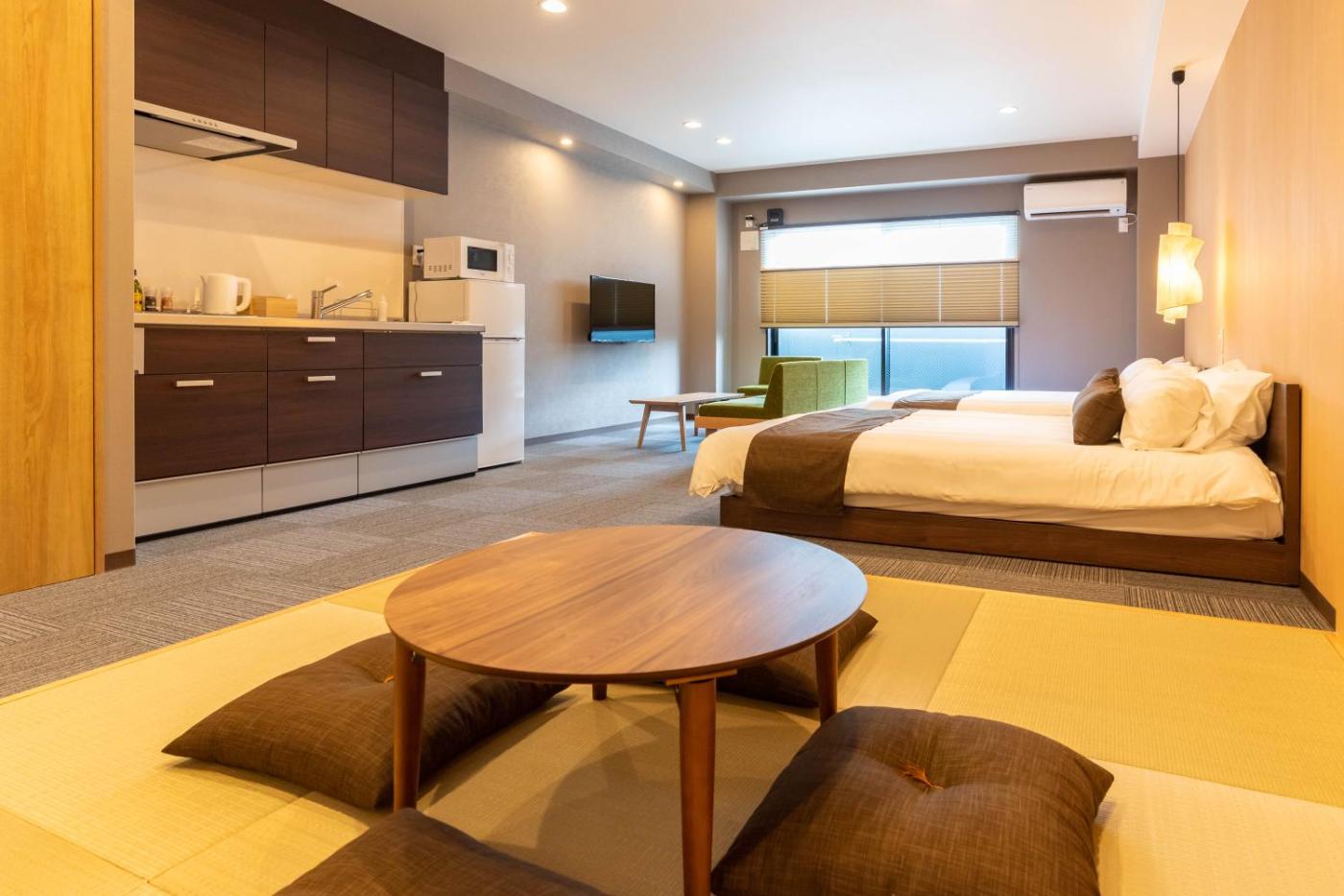 One-Bedroom Apartment. Boasting a private entrance, this air-conditioned apartment includes 1 living room, 1 separate bedroom and 1 bathroom with a shower and a hairdryer. Guests can make meals in the kitchen that is fitted with a stovetop, a refrigerator, kitchenware and a microwave. Featuring a balcony with a quiet street view, this apartment also offers a washing machine and a flat-screen TV. The unit has 2 beds and 2 futons.