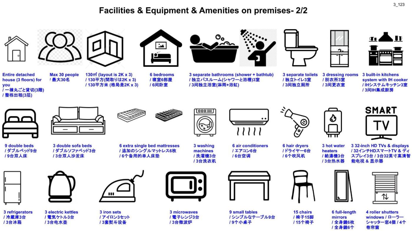Superior Suite. Boasting a private entrance, this spacious suite also includes 6 bedrooms, a seating area and 3 bathrooms with a bath and a shower. A kitchen fitted with a refrigerator, kitchenware and a microwave is available for cooking and storing food. The air-conditioned suite offers a flat-screen TV with streaming services, a washing machine, a dining area, an electric kettle as well as a quiet street view. The unit has 12 beds and 6 futons.