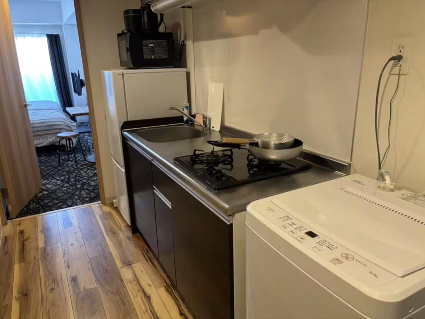 One-Bedroom Apartment. The air-conditioned apartment features 1 bedroom and 1 bathroom with a bath and a shower. Guests can make meals in the kitchen that is equipped with a stovetop, a refrigerator, kitchenware and a microwave. Featuring a balcony, this apartment also provides a washing machine, an electric kettle and a flat-screen TV. The unit offers 2 beds. ;