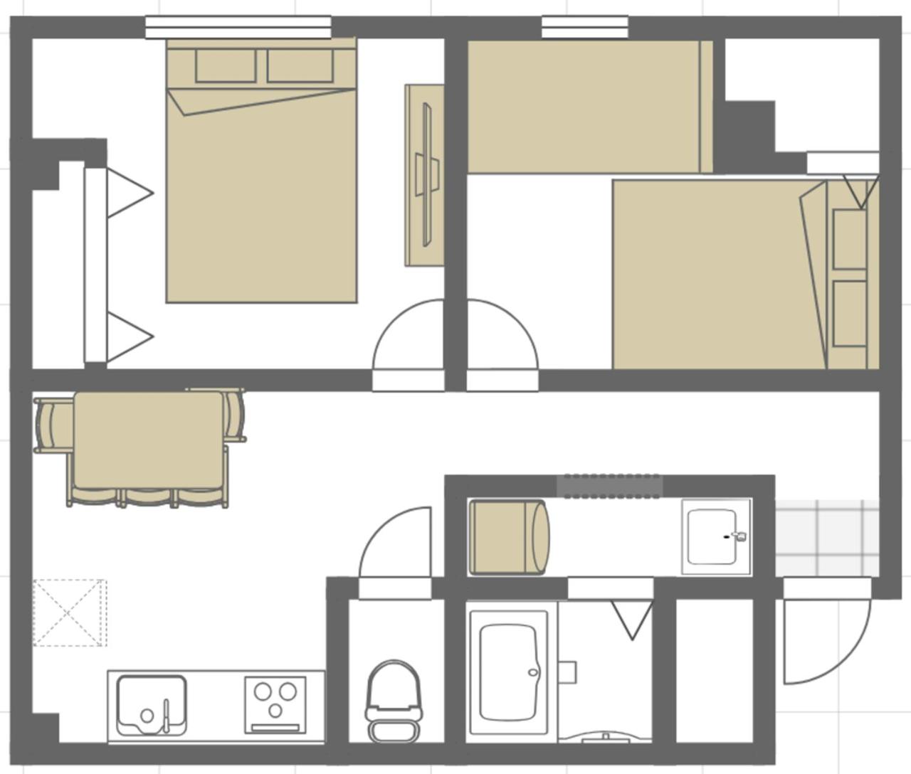 Two-Bedroom Apartment. The air-conditioned apartment has 2 bedrooms and 1 bathroom with a walk-in shower and a bath. The well-fitted kitchen features a stovetop, a refrigerator, kitchenware and a microwave. The apartment features a washing machine, a dining area, a wardrobe, a flat-screen TV with streaming services, as well as city views. The unit has 3 beds.