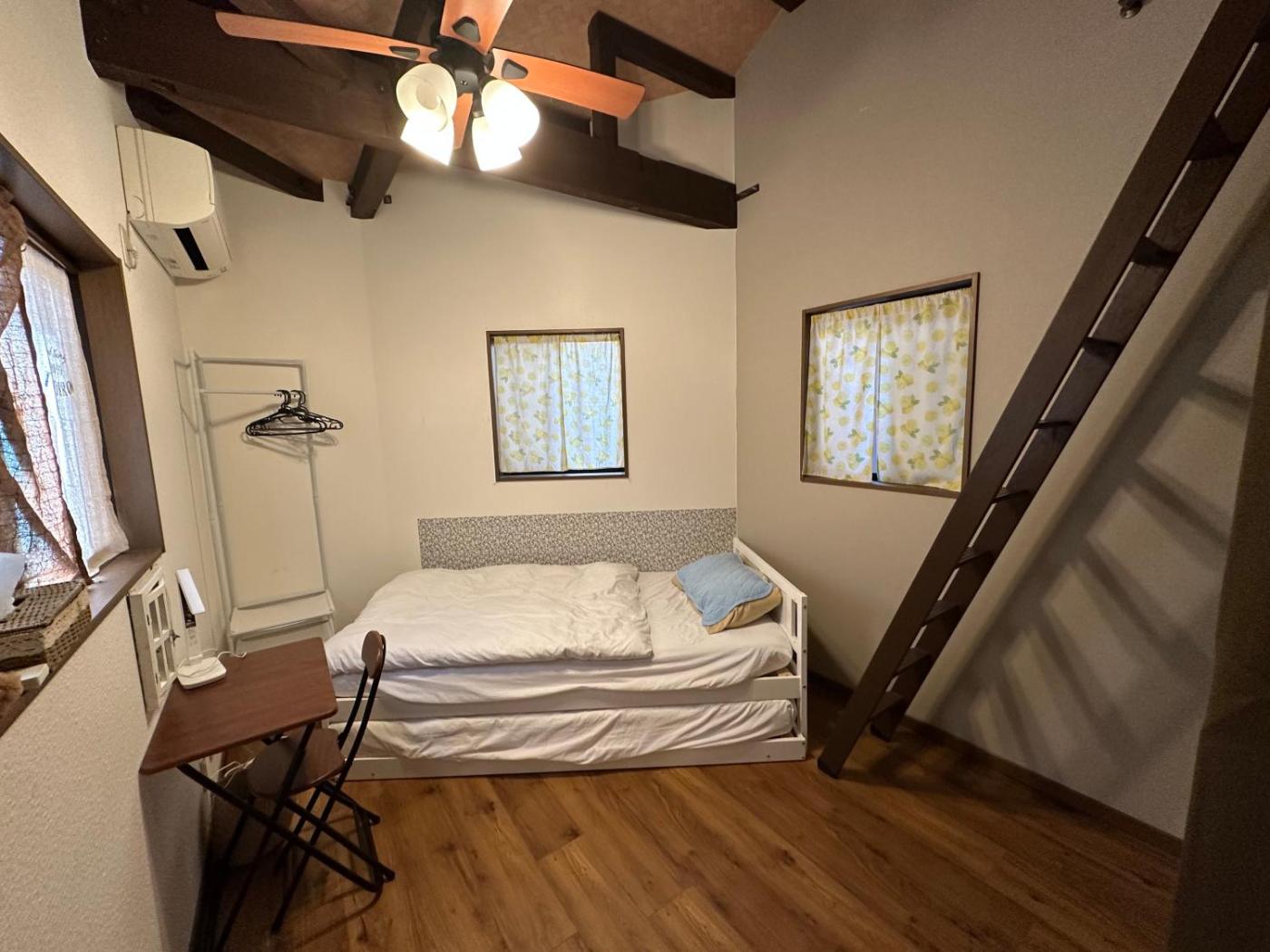 Two-Bedroom House. Featuring a private entrance, this air-conditioned holiday home comprises a kitchen, 2 bedrooms and 1 bathroom with a bath and a shower. Meals can be prepared in the well-fitted kitchen, which comes with a stovetop, a refrigerator, kitchenware and an oven. Boasting a balcony, this holiday home also provides a washing machine, tatami and a flat-screen TV. The unit offers 2 beds and 2 futons.