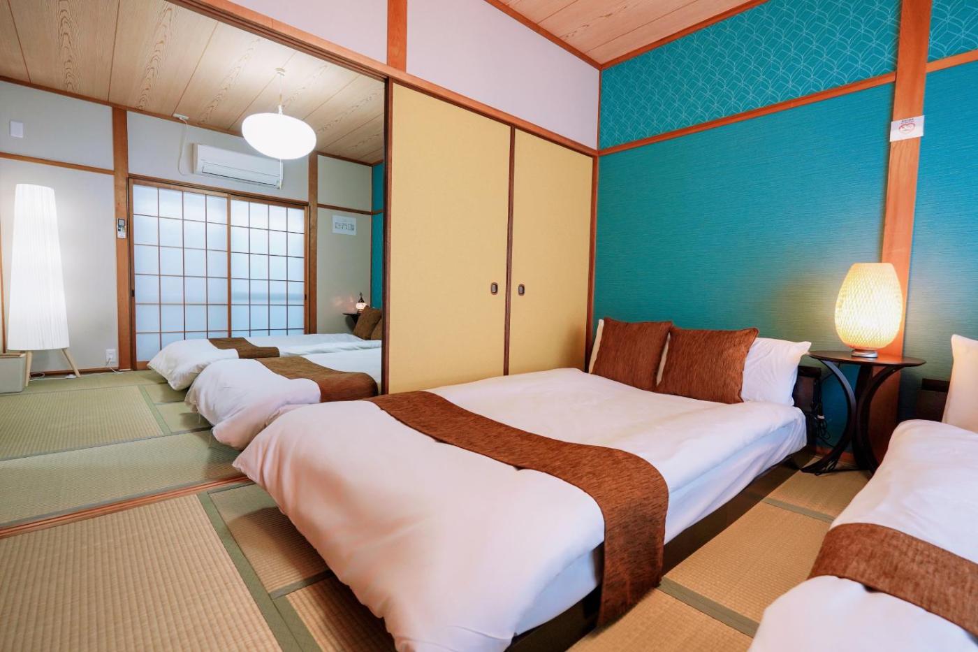 Family Room. The spacious family room offers air conditioning, tatami, as well as a private bathroom boasting a bath and a shower. In the kitchen, guests will find a refrigerator, kitchenware and a microwave. This family room has a private entrance, a tea and coffee maker, a flat-screen TV and a balcony. The unit has 6 beds.