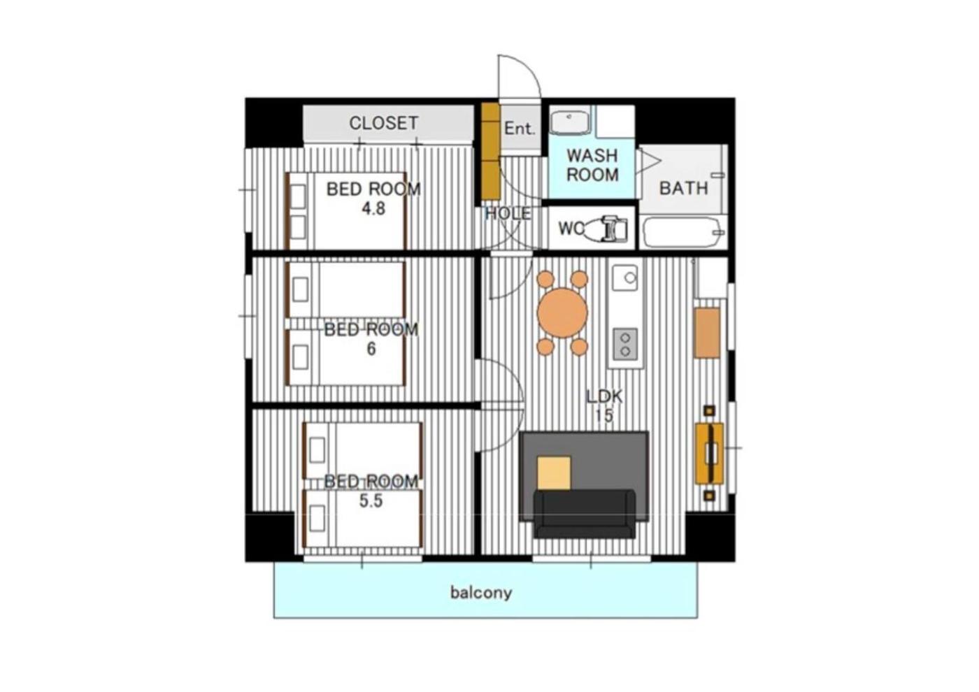 Three-Bedroom Apartment. The spacious apartment has 3 bedrooms and 1 bathroom with a bath and free toiletries. In the well-fitted kitchen, guests will find a stovetop, a refrigerator, a microwave and a toaster. The air-conditioned apartment offers a flat-screen TV, a washing machine, a coffee machine and a dining area. The unit has 5 beds.