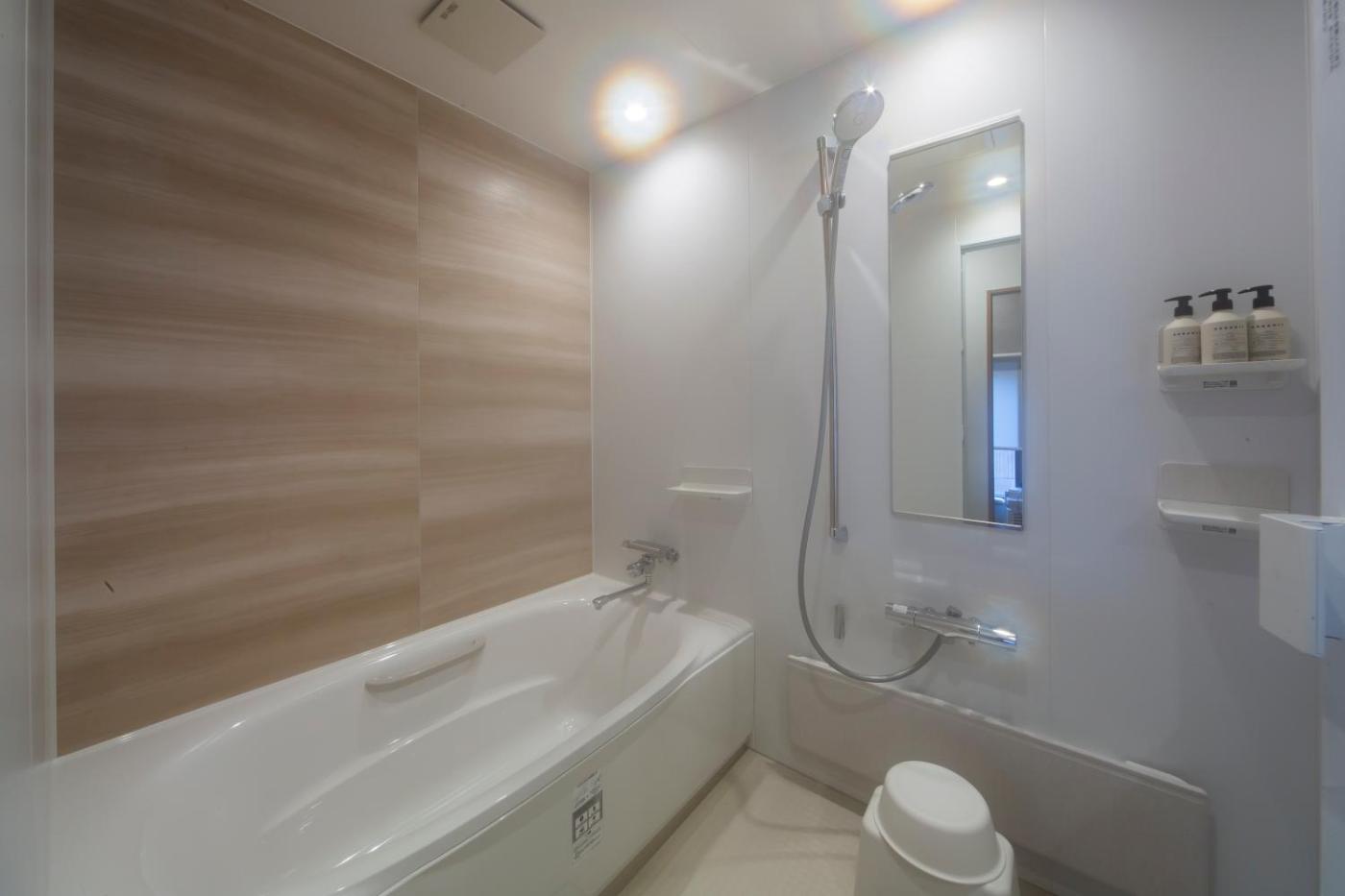 Family Room with Private Bathroom. The family room features air conditioning, a washing machine, as well as a private bathroom boasting a bath and a shower. Meals can be prepared in the kitchenette, which features a refrigerator, kitchenware, a microwave and a tea and coffee maker. The family room offers tatami, tumble dryer, a sofa, yukata, as well as a flat-screen TV. The unit has 2 beds and 4 futons.