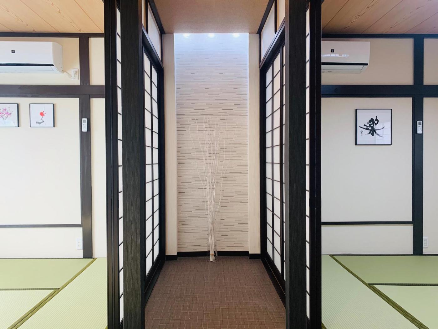 Three-Bedroom Apartment. This apartment features a fireplace. Boasting a private entrance, this air-conditioned apartment features 1 living room, 3 separate bedrooms and 1 bathroom with a shower and a bidet. In the kitchen, guests will find a stovetop, a refrigerator, kitchenware and a microwave. The apartment features a washing machine, tatami, a dining area, an electric kettle and a flat-screen TV. The unit has 2 beds and 6 futons.