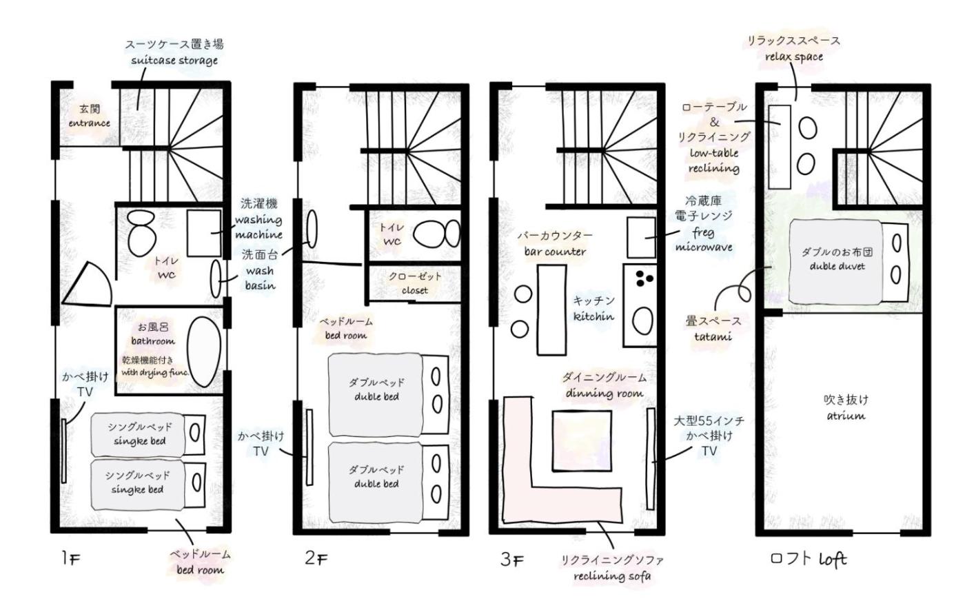 Three-Bedroom Villa. Boasting a private entrance, this air-conditioned villa features a kitchen, 3 bedrooms and 1 bathroom with a bath and a shower. Guests can make meals in the kitchen that has a stovetop, a refrigerator, kitchenware and a microwave. The villa features a washing machine, tatami, a dining area, an electric kettle and a flat-screen TV with streaming services. The unit has 4 beds and 1 futon.