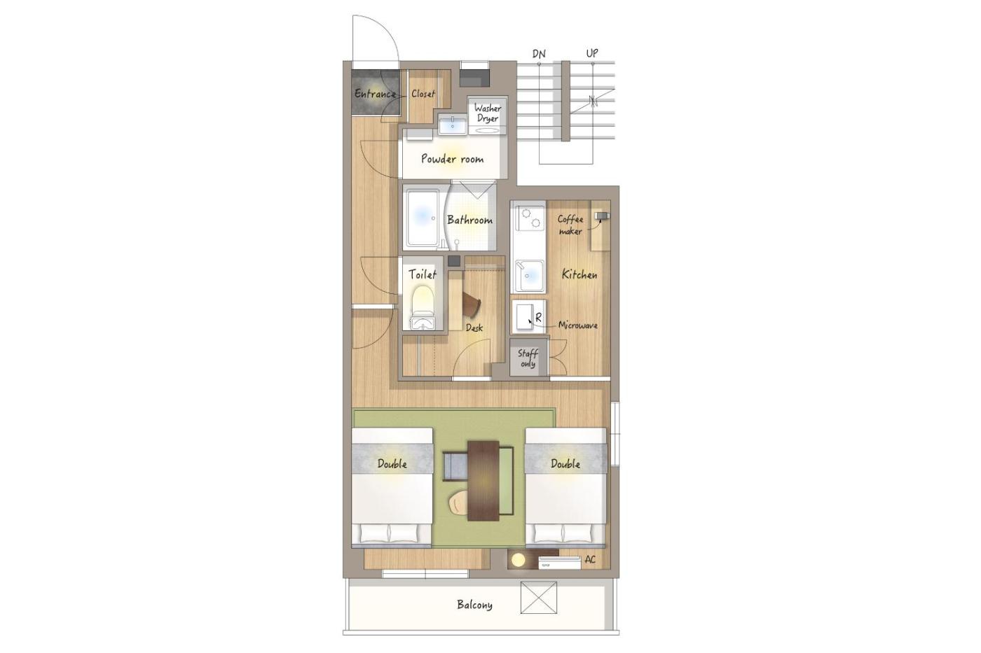 One-Bedroom Apartment. The air-conditioned apartment features 1 bedroom and 1 bathroom with a bath and a shower. Guests can make meals in the kitchen that is equipped with a stovetop, a refrigerator, kitchenware and an oven. The apartment provides a washing machine, a tea and coffee maker, a dining area as well as a balcony with a quiet street view. The unit offers 2 beds.
