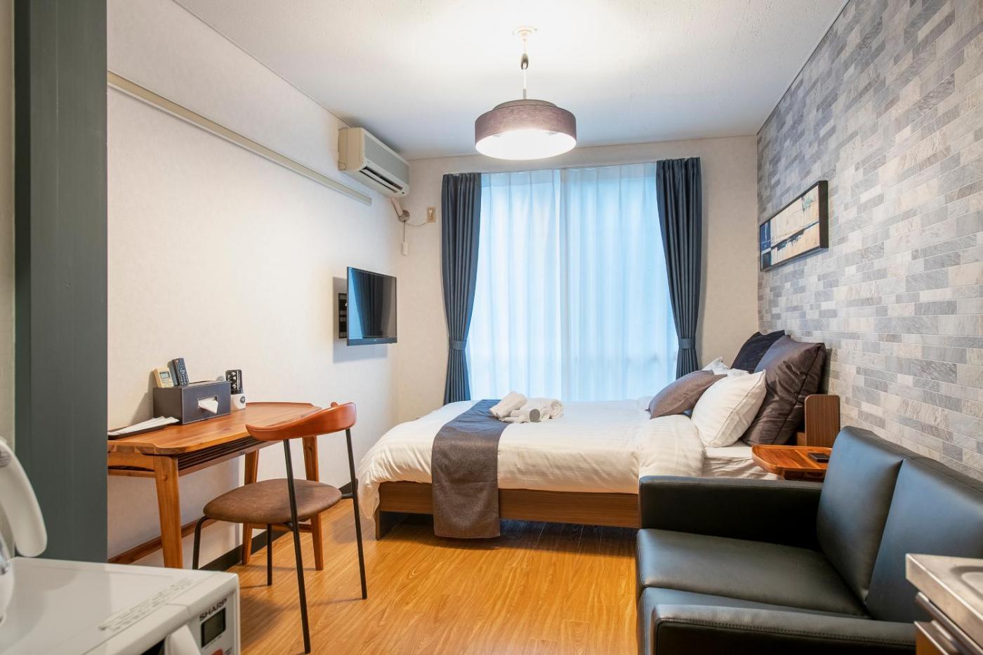 One-Bedroom Apartment. The air-conditioned apartment has 1 bedroom and 1 bathroom with a bath and a shower. Guests can make meals in the kitchenette that features kitchenware, a microwave and an electric kettle. This apartment features a sofa, heating and a flat-screen TV. The unit has 2 beds. ;