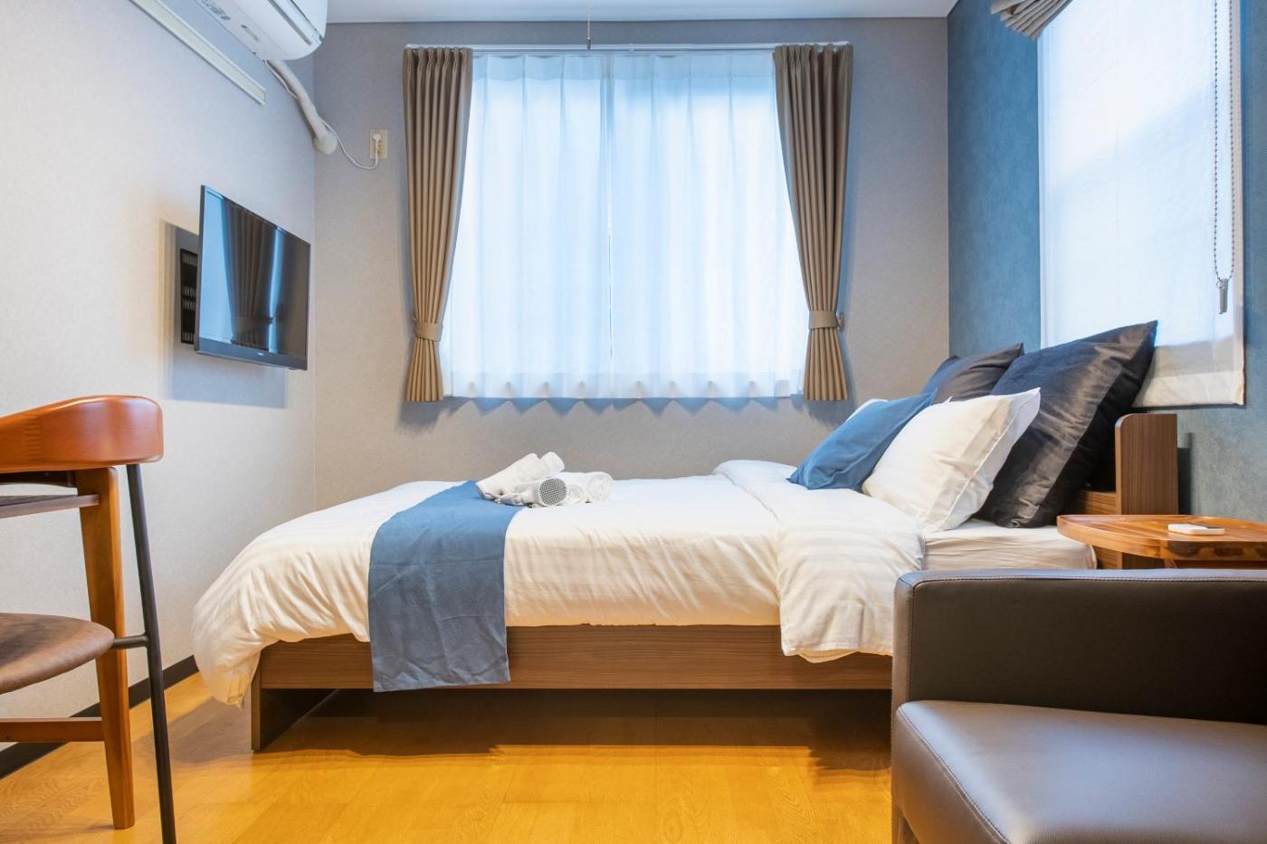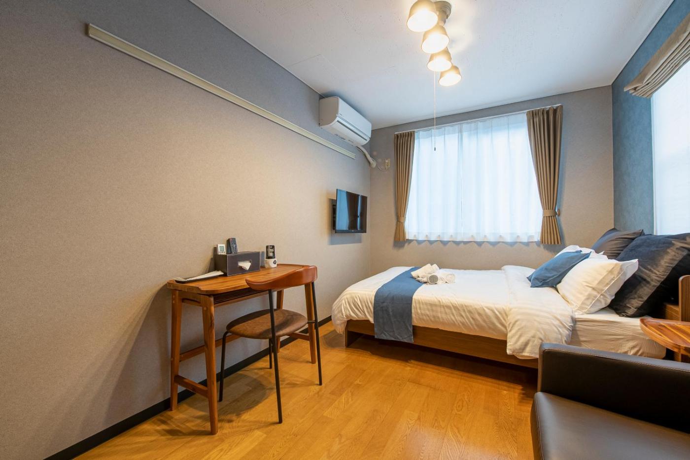 One-Bedroom Apartment. The air-conditioned apartment has 1 bedroom and 1 bathroom with a bath and a shower. The well-fitted kitchenette features kitchenware, a microwave and an electric kettle. This apartment offers a sofa and a flat-screen TV. The unit has 2 beds.