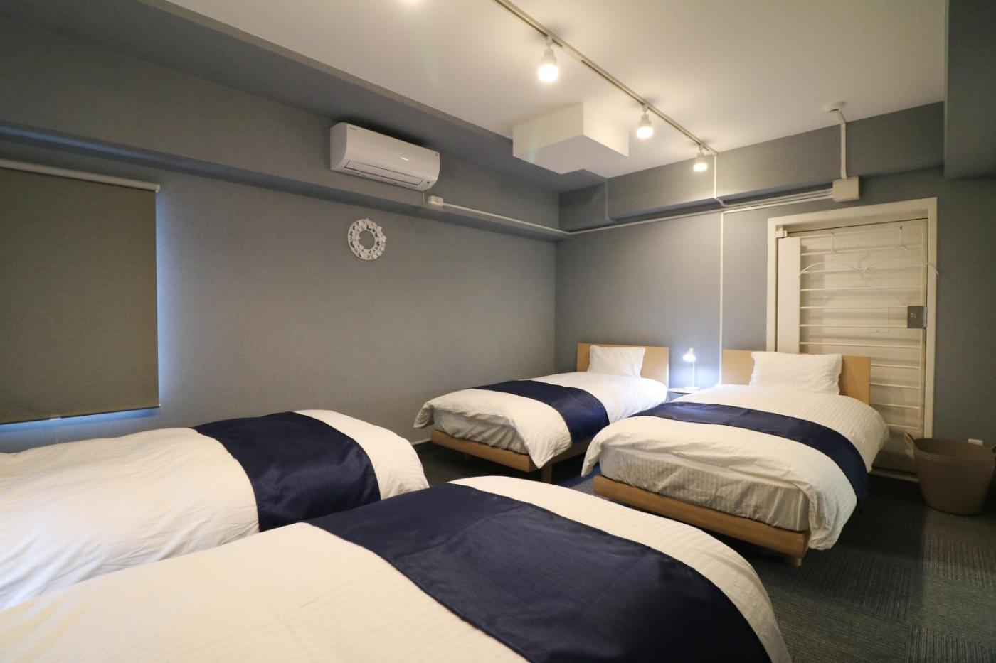 Three-Bedroom Apartment. Featuring a private entrance, this air-conditioned apartment consists of 1 living room, 3 separate bedrooms and 1 bathroom with a shower and a bidet. The well-fitted kitchen features a stovetop, a refrigerator, kitchenware and a microwave. The apartment provides a washing machine, tatami, an electric kettle, tumble dryer and a flat-screen TV. The unit offers 3 beds and 3 futons. ;