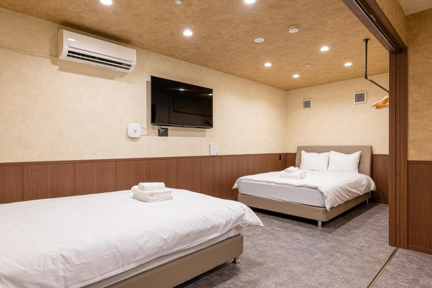 Three-Bedroom Deluxe Apartment. This apartments special feature is the hot tub. This spacious apartment consists of 1 living room, 3 separate bedrooms and 2 bathrooms with a bath and free toiletries. The fully equipped kitchen features a stovetop, a refrigerator, kitchenware and a microwave. The air-conditioned apartment provides a flat-screen TV, a washing machine, tatami and a dining area. The unit offers 8 beds.