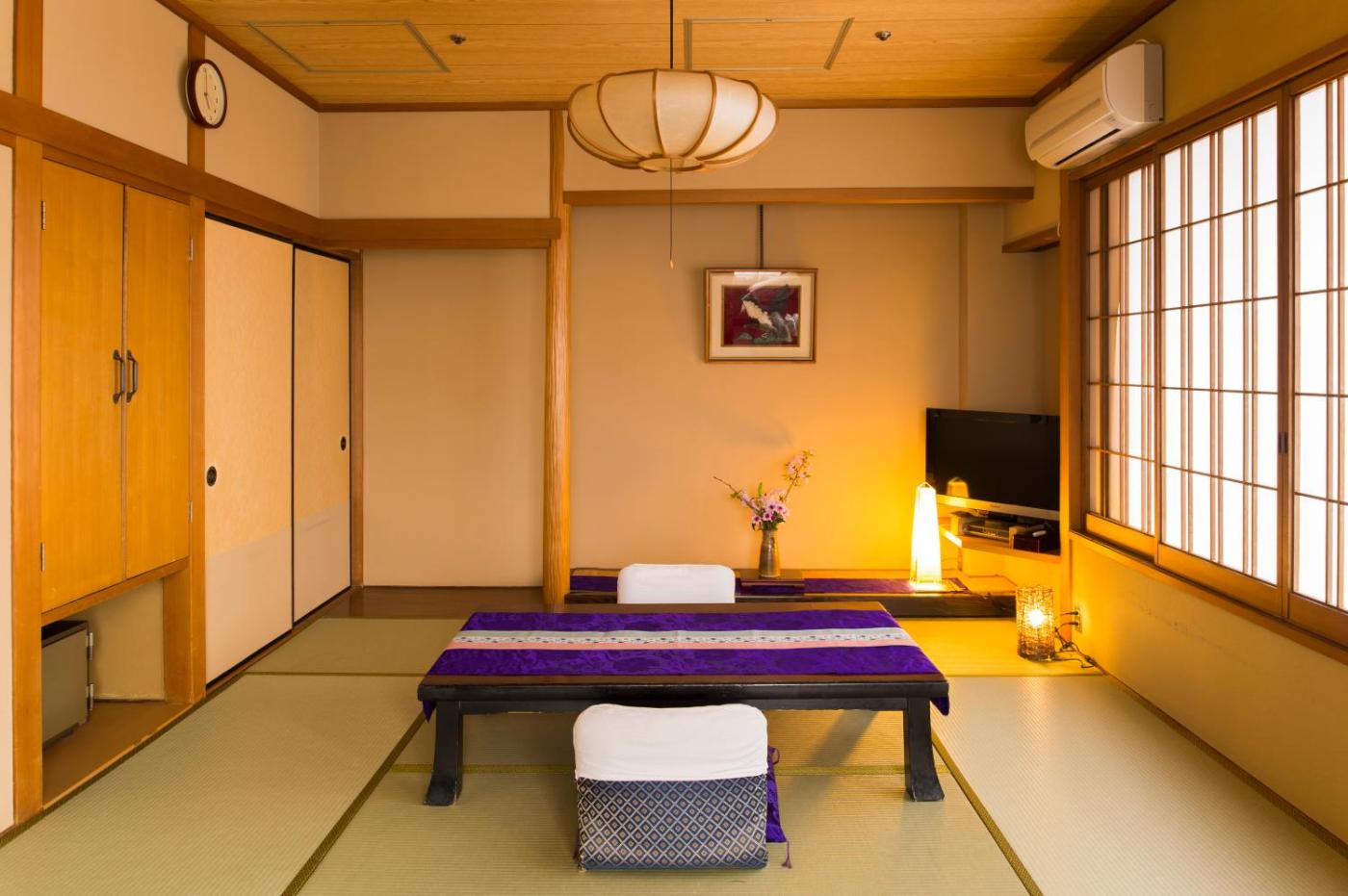 Japanese-Style Quadruple Room. The quadruple room features air conditioning, tatami, as well as a private bathroom boasting a bath and a shower. The quadruple room provides a flat-screen TV, a safe deposit box, an electric kettle, yukata as well as city views. The unit has 5 futons.